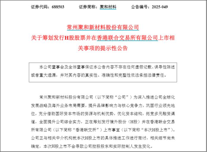 华夏能源网(公众号hxny3060)获悉,11月4日,聚和材料(SH:688503)发布公告称,公司正在筹划发行境外股份(H股)并在香港联交所上市事宜。