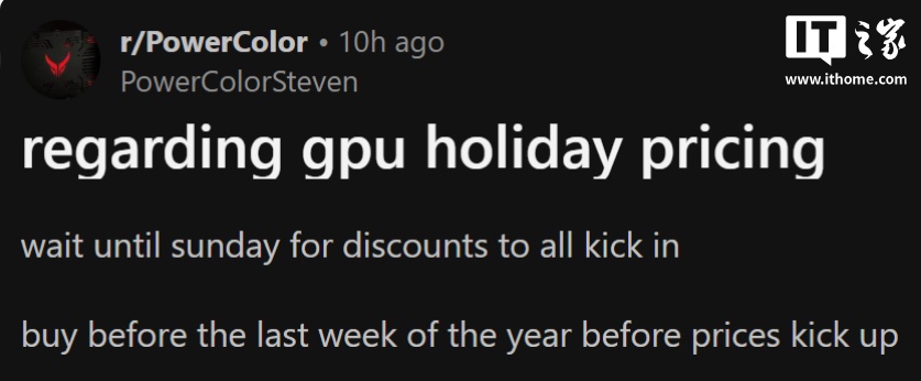 撼讯代表表示,游戏玩家应该在年底最后一周前购买新显卡,因为价格会上涨。不过其后续表示,内容仅代表个人看法。