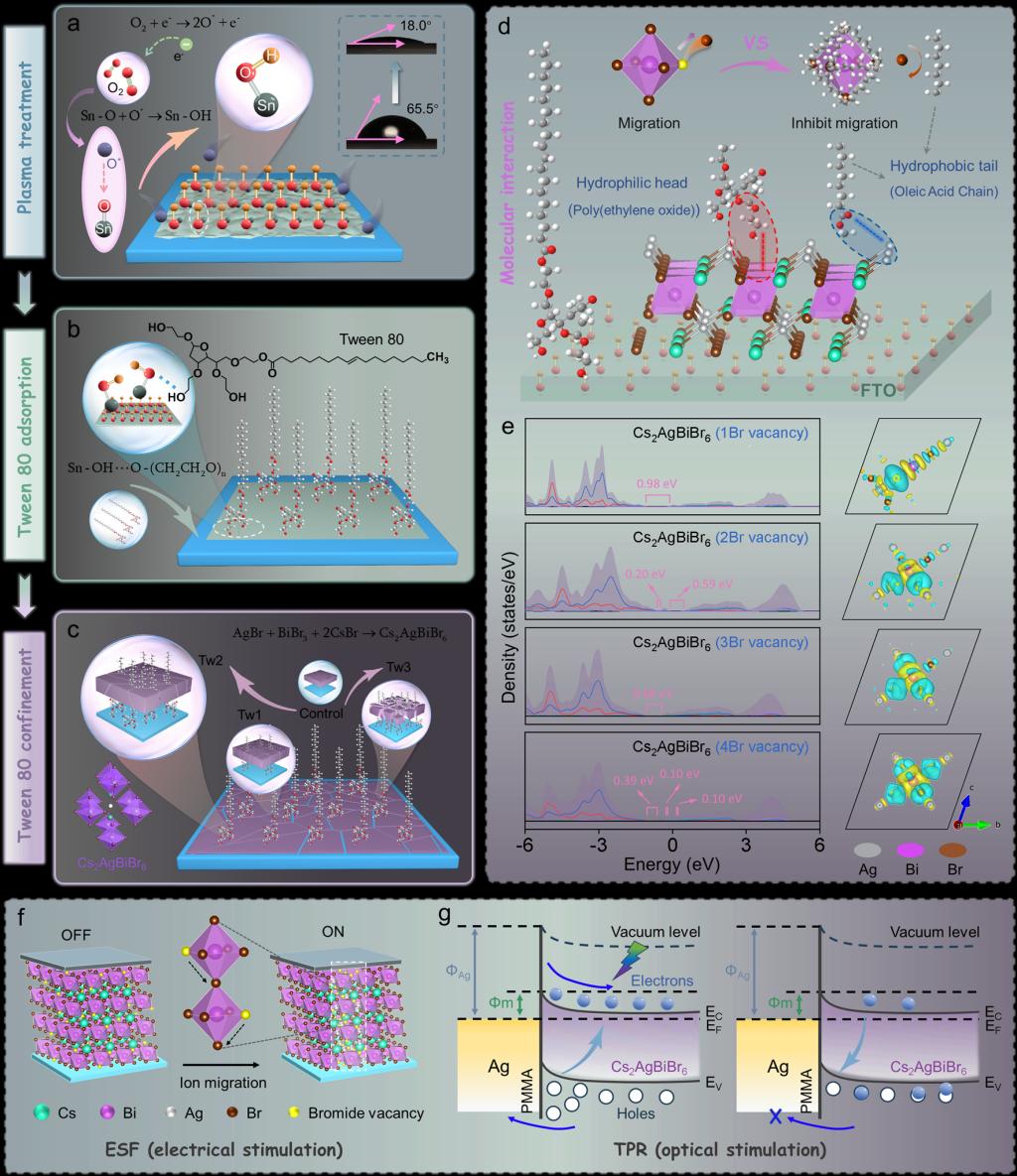 基于上述背景,西安交通大学前沿院邵金友、孙柏教授团队报道了一种利用双亲长链“Tween 80”封闭钙钛矿Cs2AgBiBr6成核的限制策略。借助原位表征技术和第一性原理计算,该研究团队创新的提出了一种特异性抑制溴空位形成的动力学模型。其中,Tween 80的疏水部分(油酸链+酯基)从源头上抑制了溴空位的形成,根据软硬酸碱理论,银离子和铋离子可以与酯氧原子形成稳定的配位键。这种配位有效地将金属阳离子“锁定”在八面体中心,减轻了热振动或晶格应变引起的配位崩塌,从而降低了溴离子脱附的驱动力。此外,Tween 80的亲水部分(PEO链)可以通过八面体桥接位点的偶极-阴离子相互作用锚定溴离子。通过计算得出PEO链中的单个C、H和O原子与钙钛矿八面体桥接位点相互作用时体系的形成能均为负值(Abs-C = -1.58 eV,Abs-H = -0.46 eV,Abs-O = -1.53 eV),表明这些原子吸附到钙钛矿晶体结构上是一个热力学自发过程。PEO链在晶体表面吸附产生空间位阻,调节结晶速率,这为溴离子扩散到有序晶格位点提供了充足时间,进一步抑制了溴空位的形成。