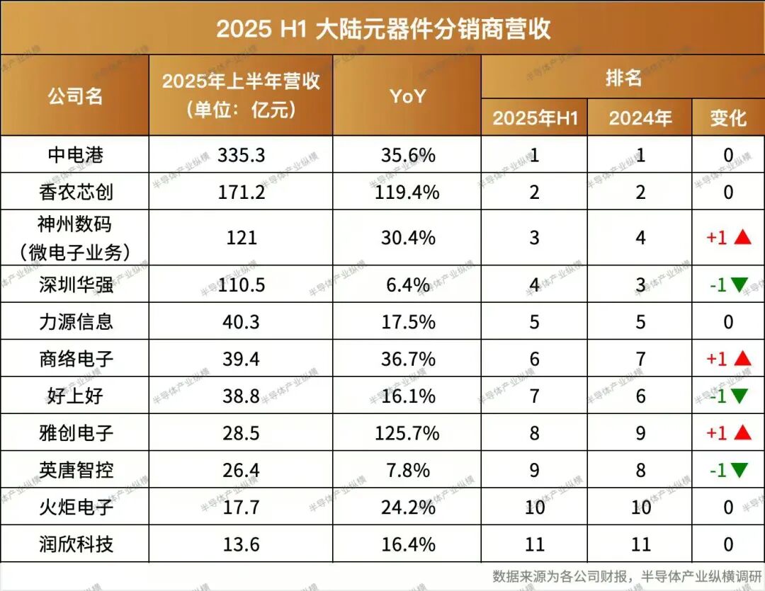 值得欣喜的是,2025年上半年中国大陆头部分销商全部实现了营收增长。同时,中国大陆分销商正在提高国内市场占有率,2025年上半年中国大陆的分销商营收总额在本次统计中占比15.2%,而这一数据在2024年上半年为12.3%。