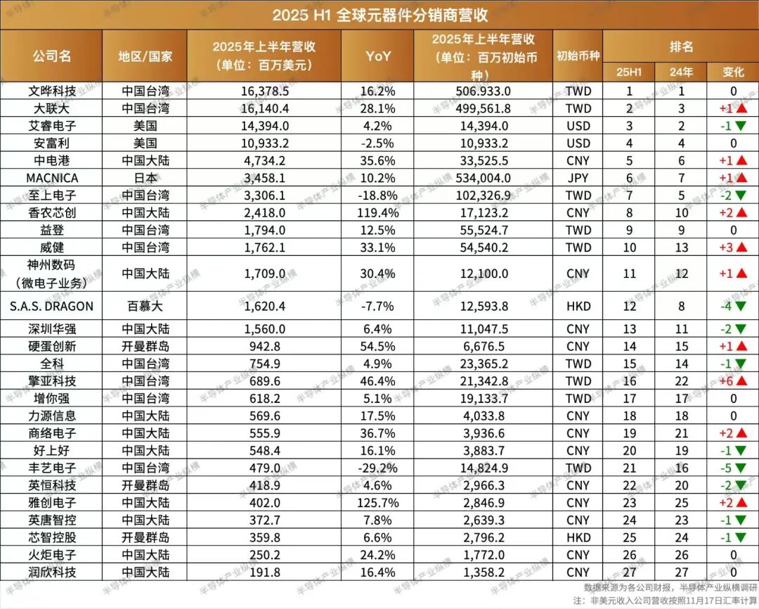 2025年上半年,全球营收前十的元器件分销商名单产生了变化。2024年营收排名第8的S.A.S. DRAGON(时捷集团)跌出前十,而来自中国台湾的威健凭借33.1%的增长从第13位跃升至第10位。