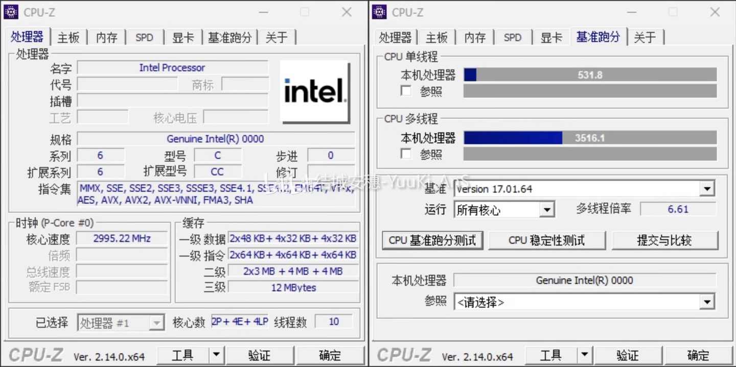 在架构方面,该 ES 处理器拥有 2 个性能核心(P-Core)、4 个能效核心(E-Core)与 4 个低功耗核心(LP-E Core),并配有 11 MB L2 缓存与 12 MB L3 缓存;CPU 的基准频率为 3.0 GHz,最高加速频率 3.2 GHz,同时集成的 4 个 Xe3 图形核心通过 2.5 GT/s 的 PCIe 链路运行;属于 A0 步进版本。