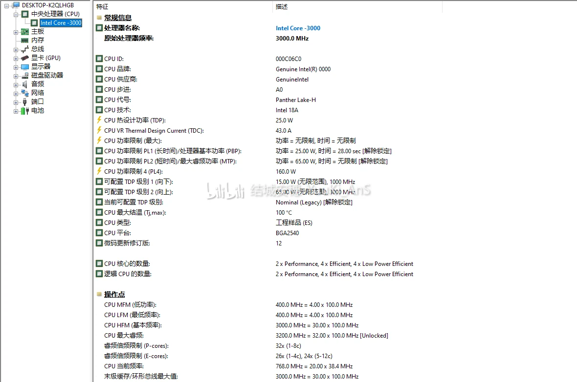 在功耗方面,这颗芯片属于 25W 的 Panther Lake 系列,PL1 设定为 25W,PL2 为 65W,PL4 则达 160W,最高温度(Tj Max)为 100℃。IT之家注意到,其 P-Core 全核可达 3.0 GHz,而 4 个 E-Core 的频率则为 2.6 GHz。