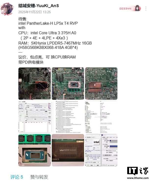 IT之家 11 月 22 日消息,博主 @结城安穗-YuuKi_AnS 今日放出了一组关于从未曝光过的英特尔 Panther Lake-H 处理器工程样品(ES)的实拍图和测试信息,可能隶属于 Ultra 3 系列。