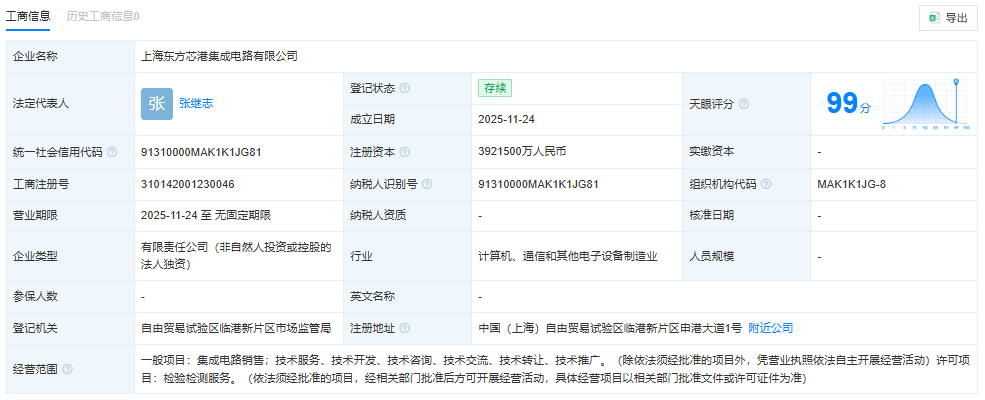 天眼查显示,上海东方芯港集成电路有限公司于2025年11月24日正式注册成立,注册资本达392.15亿元,法定代表人诶张继志,注册地址位于中国(上海)自由贸易试验区临港新片区申港大道1号。