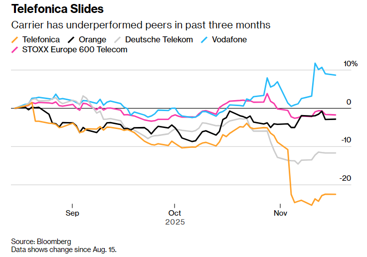 在过去三个月里,西班牙电信是斯托克欧洲600电信指数中表现第二差的股票,股价下跌了21%,而该基准指数的跌幅约为7%。(校对/赵月)