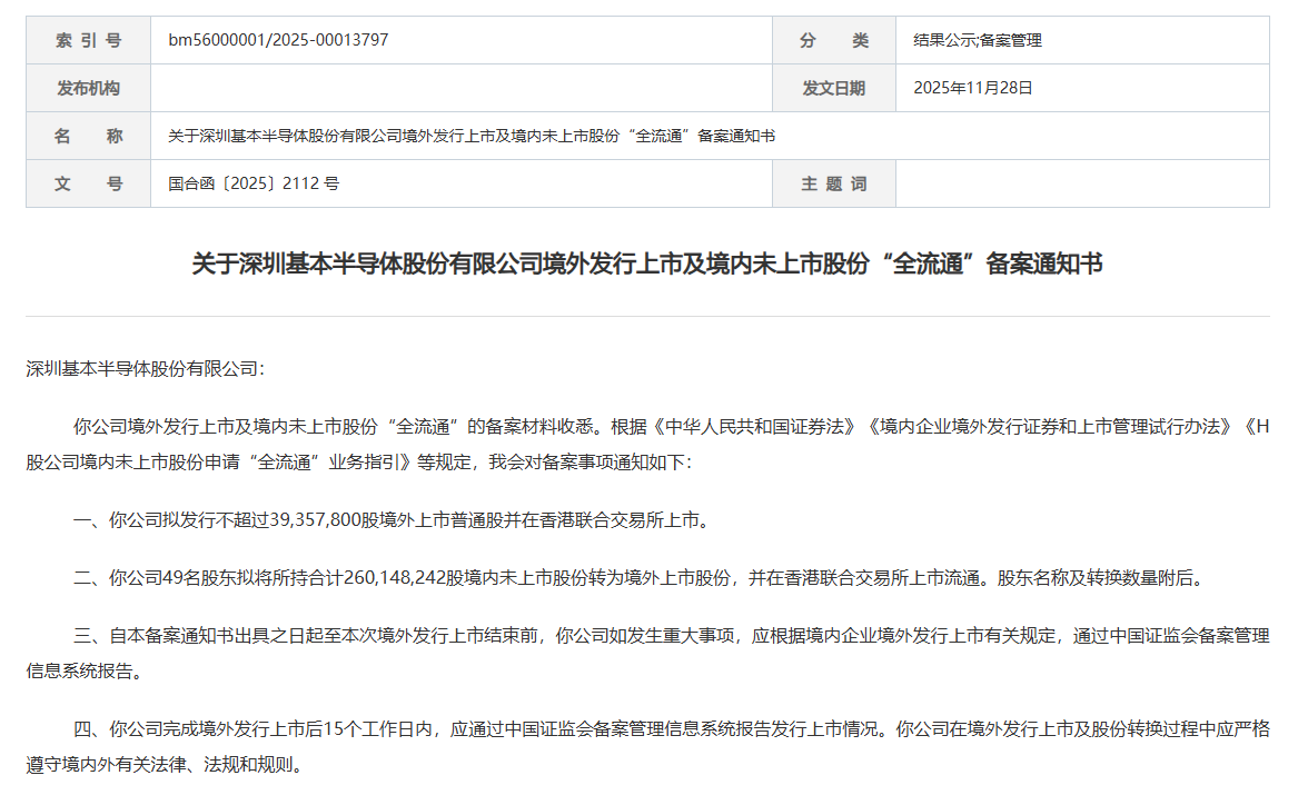 11月28日,中国证监会网站正式披露《关于深圳基本半导体股份有限公司境外发行上市及境内未上市股份“全流通”备案通知书》,标志着基本半导体境外发行上市及境内未上市股份“全流通”事项已通过证监会备案,为其登陆香港联合交易所铺平了关键道路。
