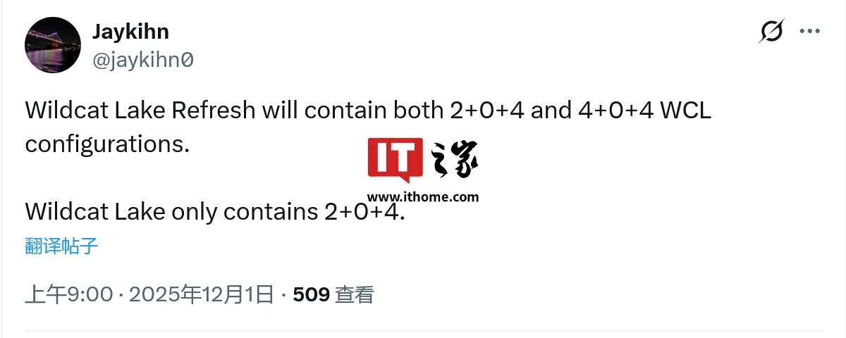 IT之家 12 月 1 日消息,消息人士 @jaykihn0 北京时间今早在 X 平台爆料称,英特尔低端处理器 "Wildcat Lake" 未来将迎来一个 "Refresh" 刷新版本,在原版的 2P + 0E + 4LPE 配置外新增一个 4P + 0E +4LPE 的 CPU 规格。