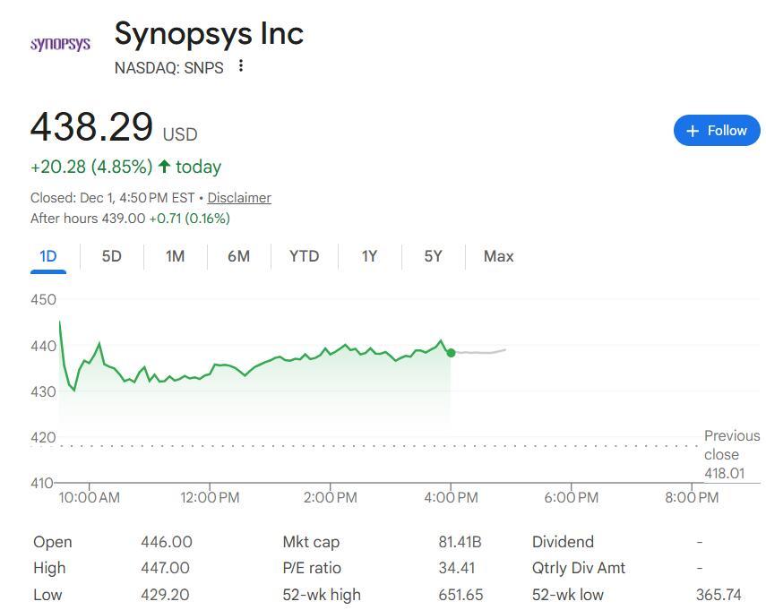 根据两家公司周一发布的声明,英伟达以每股414.79美元的价格购买了新思科技约480万股股票,较上周五收盘价折让约0.8%。这些股票通过私募配售方式发行。