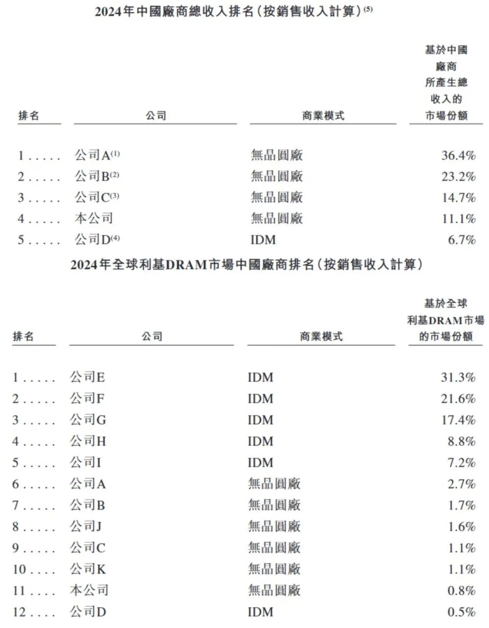 力积存储所生产是利基DRAM产品。根据弗若斯特沙利文的资料,按2024年利基DRAM收入计,力积存储在全球利基DRAM市场的中国公司中排名第4,市占率为11.1%;其在全球利基DRAM市场中的所有参与者中排名第11,市占率为0.8%。