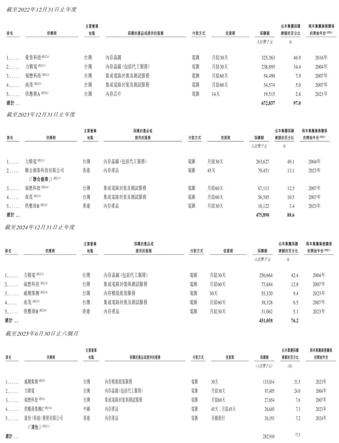 报告期内,力积存储向前五大供应商的采购金额分别约为人民币6.728亿元、4.759亿元、4.511亿元及2.829亿元,分别占各期间采购总额的约97.0%、88.6%、76.2%及77.5%,显示出供应商集中度较高的特点。