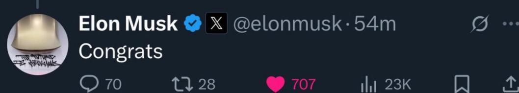 一直对谷歌咬牙切齿的马斯克也破天荒送上了一句“祝贺”(Congrates),精准体现了字数越少,怨气越深。