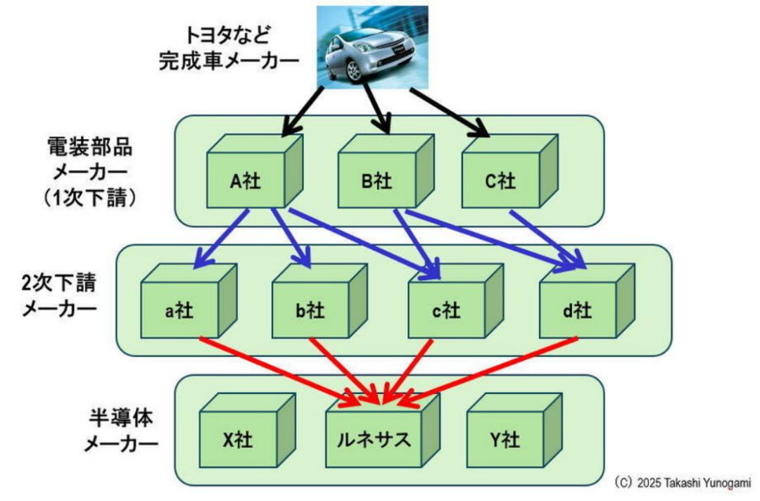 当时,丰田将订单分配给了三家一级供应商,以降低采购风险,如图 4 所示。然而,当我们查看这些一级供应商——半导体制造商时,我们发现,实际上所有的微控制器都集中在瑞萨电子那珂工厂。
