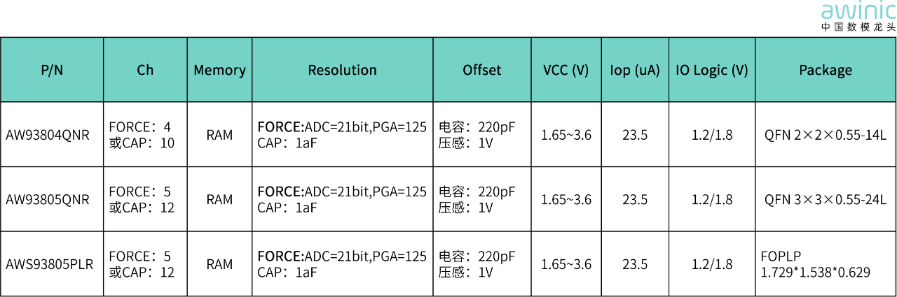产品应用面临需要同时使用force和cap应用场景时,往往会采用多个独立芯片完成不同功能,或针对单一功能需要协同工作实现,集成式芯片封装优势可以减少占板面积。例如AW93804QFN和AW93310QFN对比在封装一样的前提下迭代增加了电阻式压感模组的检测应用。