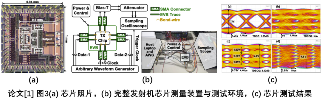 图1展示了线性调制发射机的电路架构图。图2(a),(b)分别展示了具有固有前馈均衡功能的AMUX结构和于击穿电压三倍器的驱动器原理图。图3(a),(b),(c)分别展示了提出的发射机芯片面积、测量装置与测试环境,及测试结果。
