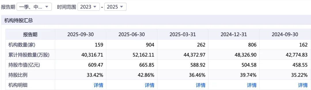 但截至第三季度末,持有豪威集团股份的机构投资者数量降至159个,合计持有4.03亿股,持股比例也降至33.42%。