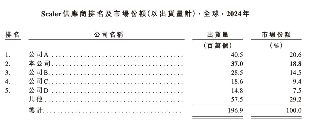 根据弗若斯特沙利文报告,2024年,按出货量计,公司在全球scaler行业中排名第二,在ASIC scaler行业中排名第一。