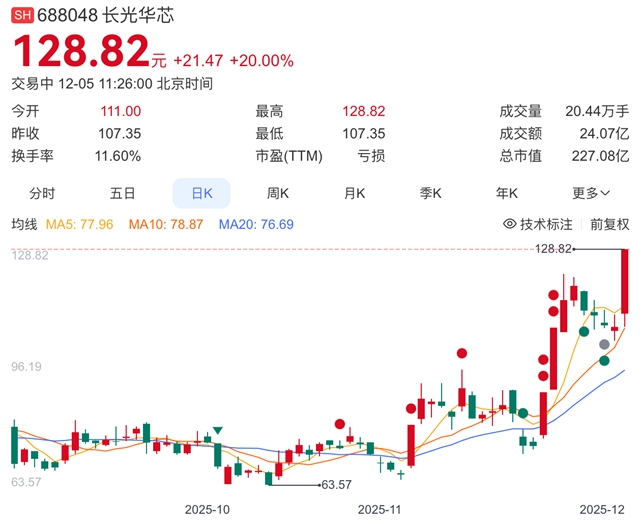 截止发稿,长光华芯市值已达227亿元,股价相比一个月前接近翻倍,一年时间里更是增幅超过200%。