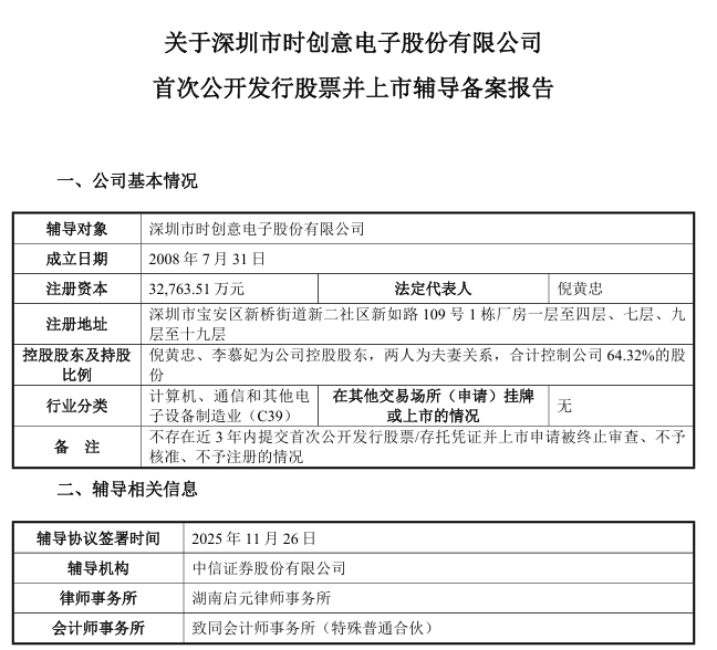 近日,深圳市时创意电子股份有限公司(以下简称“时创意”)首次公开发行股票并上市辅导备案获证监会披露,辅导机构为中信证券。此举标志着这家国家专精特新重点“小巨人”企业正式开启IPO进程,向资本市场迈出关键一步。