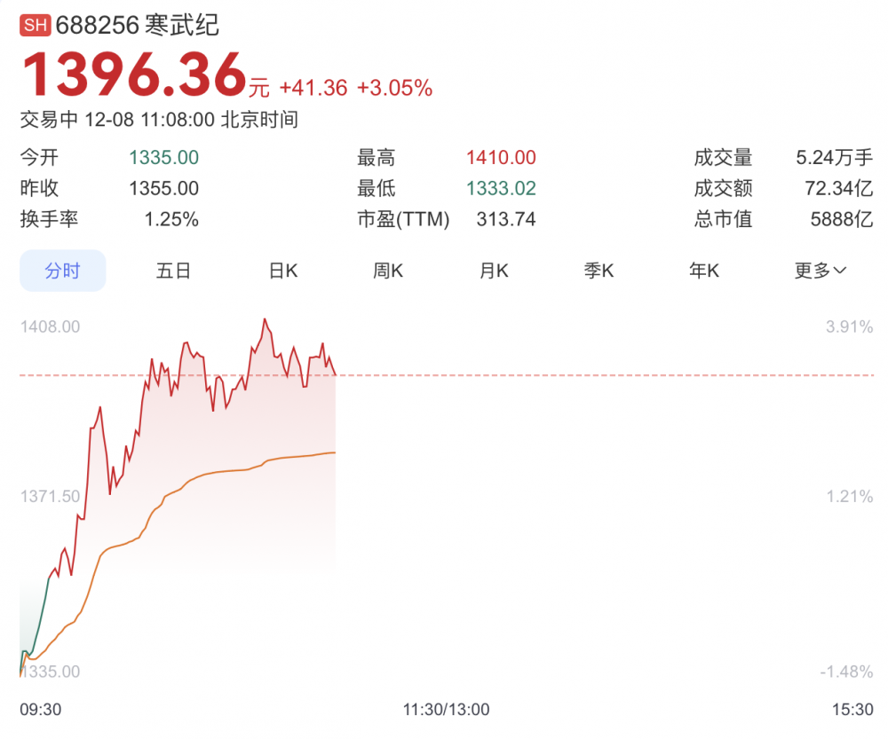 目前,寒武纪是A股市场的AI芯片龙头。截止发稿,寒武纪市值达5888亿元。