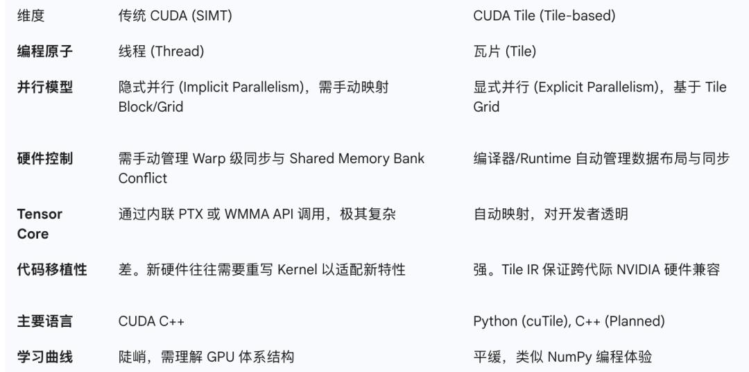 通过这种对比可以看出,CUDA Tile实际上是英伟达对AI编程范式的一次「降维打击」——将复杂的硬件细节封装在编译器内部,只暴露算法逻辑。