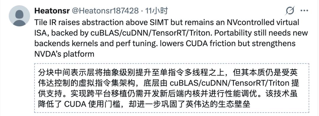 他的理由是当英伟达的GPU也转向Tile瓦片结构,而其他硬件厂商一样转向瓦片架构,AI内核将更容易移植。