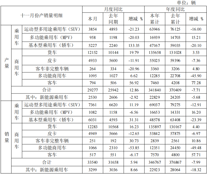 新能源乘用车销量方面,11月销量3299辆,同比增长8.66%,本年累计销量22923辆,同比下降18.32%。