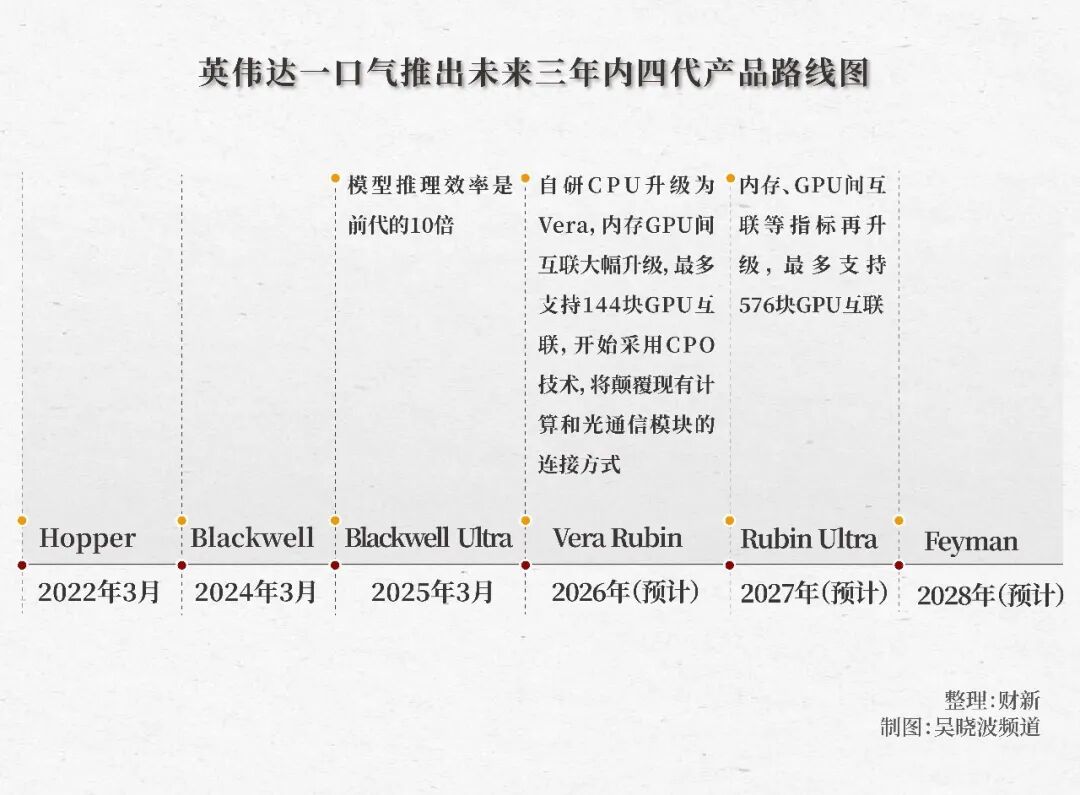 而布莱克威尔(Blackwell)也将很快让出一号位,在今年英伟达公布的未来芯片路线图里,未来三年里,鲁宾(Rubin)、费曼(Feyman)将陆续登场。
