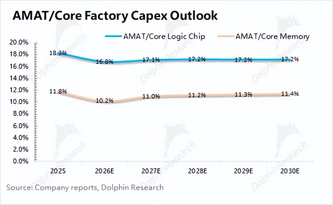 结合各公司的交流口径及市场情况,海豚君预计2026年逻辑类资本开支有望提升至884亿美元,存储类资本开支有望达到758亿美元,其中三星、海力士、美光都将加大资本开支(但主要是HBM的资本开支,这个领域应用材料设备竞争力不足)。