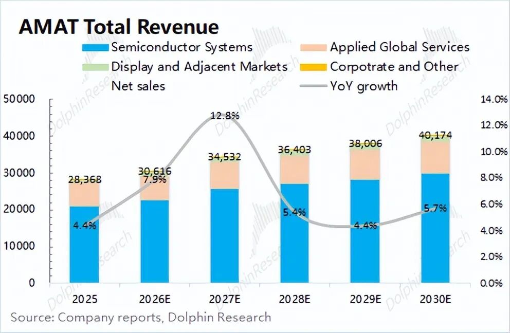综合来看,预期应用材料AMAT的收入端有望从283亿美元成长至400亿美元,复合增长率约为7%左右。