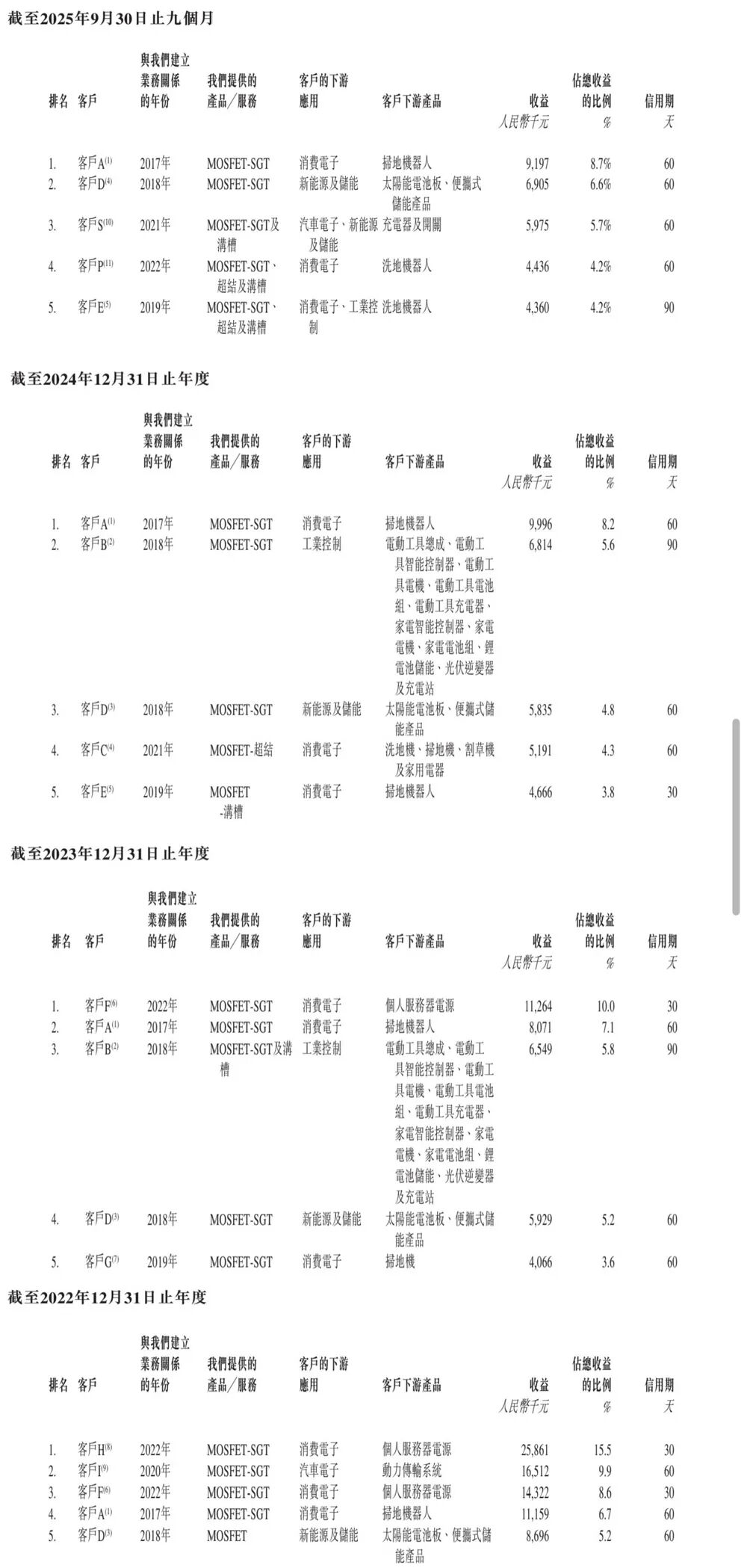 在2022年、2023年、2024年以及2025年前9个月,按产品线划分,MOSFET分别贡献了报告期内尚鼎芯99.9%、99.9%、99.8%和99.8%的营收。