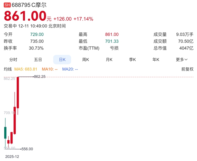 C114讯 12月11日消息(云青)国产GPU厂商摩尔线程近日上市后持续得到资本市场的追捧,截止发稿,摩尔线程报861元/股,总市值突破4000亿元,达到4047亿元。