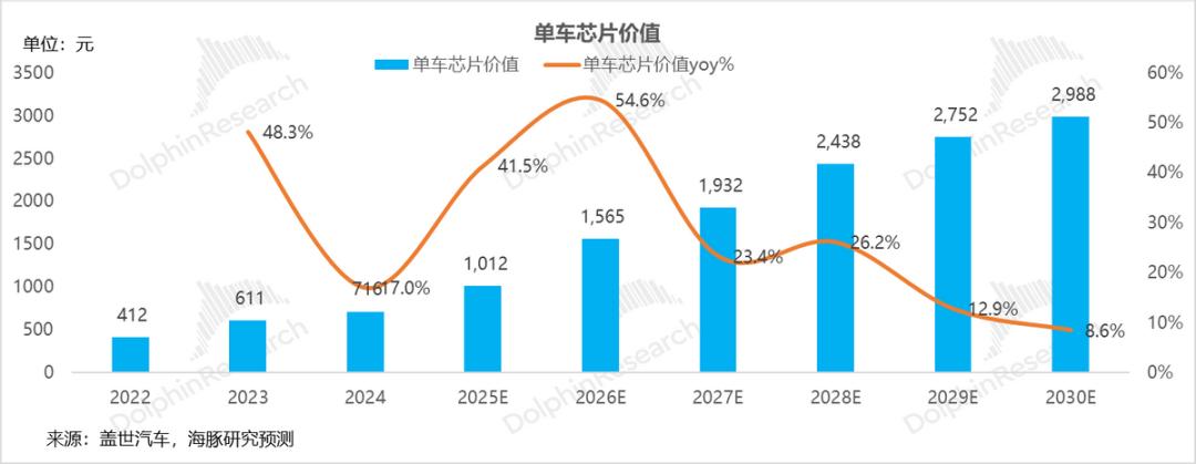 海豚君预计单车芯片价值将在2030年增长至近3000元,主要由大算力芯片占比的提升所带动 (200 TOPS以上芯片占比达到78%)。