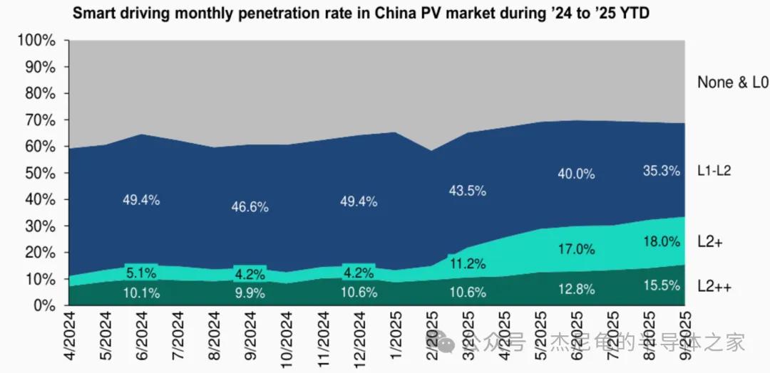 但2025年,在以比亚迪为首的“智驾平权” 将高速NOA下沉到10-20万元级别的平价车型中;以华为和新势力为首的“智驾引领”梯队则加速普及高阶的城市NOA,L2+及以上9月达到了33.5%,智驾渗透率正在加速提升。