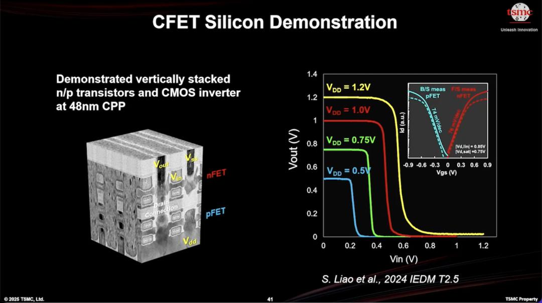 在刚刚结束的IEDM 2025上,台积电首次证实了采用下一代晶体管技术——互补场效应晶体管(CFET)的集成电路的运行情况。