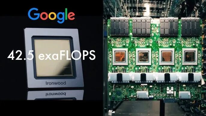 Ironwood 的核心亮点是性能跃升:单芯片 FP8 计算达4.6 PFLOPS(每秒 1000 万亿次浮点计算),比 第五代TPU提升 10 倍,是第六代TPU的 4 倍。