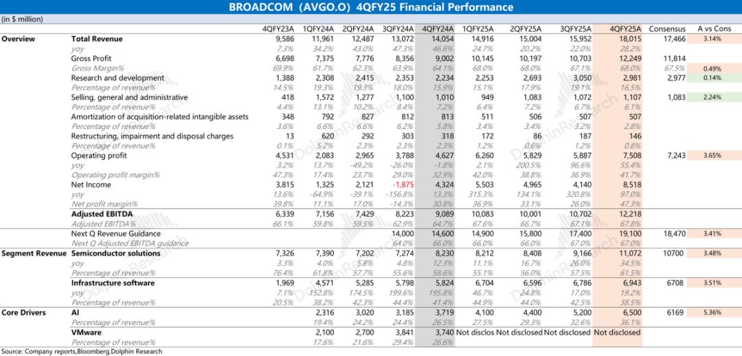 博通此前的业绩增长主要来自于AI业务和VMware的收购并表,因而AI业务中的定制ASIC芯片和VMware的定价调整策略,是市场的最主要关注点。具体业务来看: