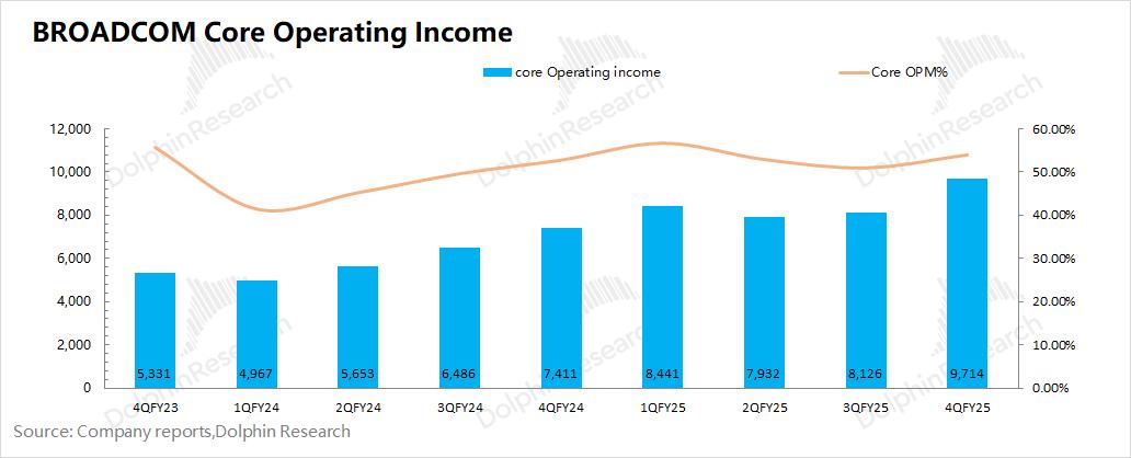 相比于净利润,海豚君认为核心经营利润(=毛利润-研发费用-销售及管理费用)更能反应公司真实的经营情况。博通AVGO本季度实现核心经营利润97亿美元,环比增加16亿美元,主要来自于AI业务增长的带动。