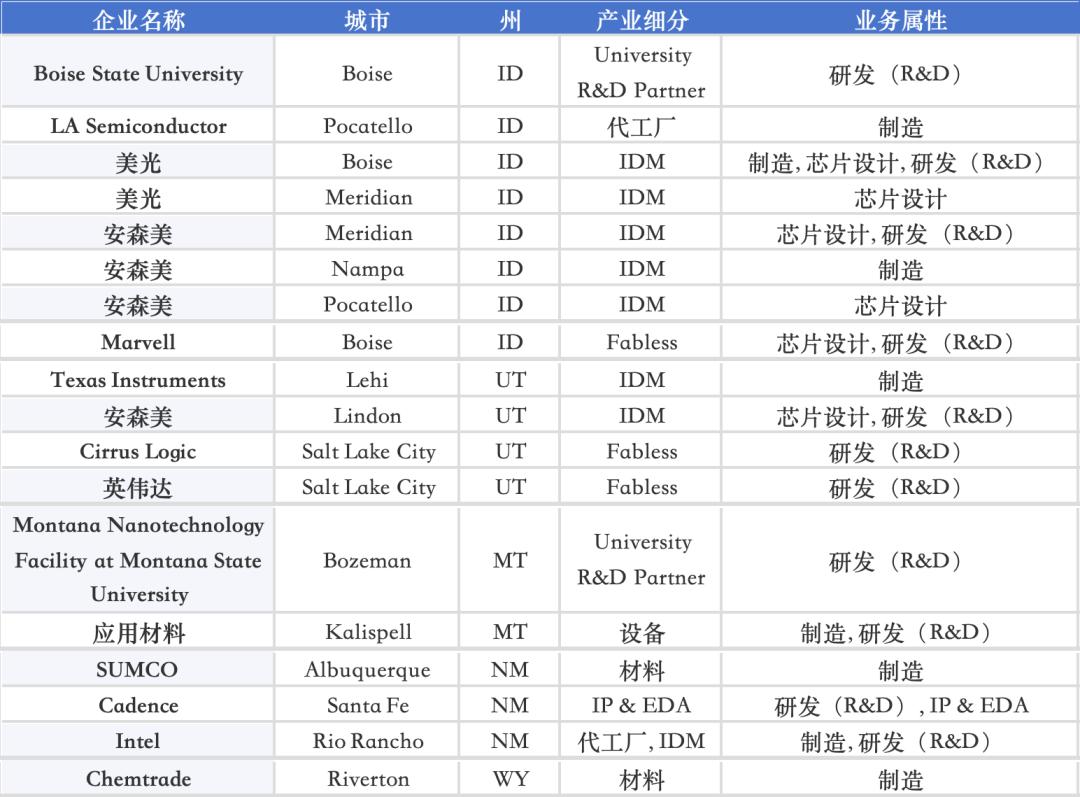 进一步向西、向北延伸到 Idaho(爱达荷)、Utah(犹他)、Montana(蒙大拿)、New Mexico(新墨西哥)等“山地州”,则形成了存储 + 设备 + 化合物半导体 + 高校研究的内陆技术带:Idaho 以 Micron Meridian 与 Boise State University 为代表,是存储与工艺研发的重要基地;Utah 聚集 BYU、Utah State University 与 Onto Innovation,在检测计量与设备端具备优势;Montana 依托 Montana State University 与 Applied Materials 的设备布局,承担部分前道工艺研发;New Mexico 则以 Intel Rio Rancho 的封装 / IDM 项目、Cadence 的研发中心以及 SUMCO / EMD 等材料企业,为美国西南方向提供制造与设计协同能力。Wyoming(怀俄明)由 Chemtrade 等材料企业承担化学品与工业材料供应,为内陆地区提供工艺材料补链能力。