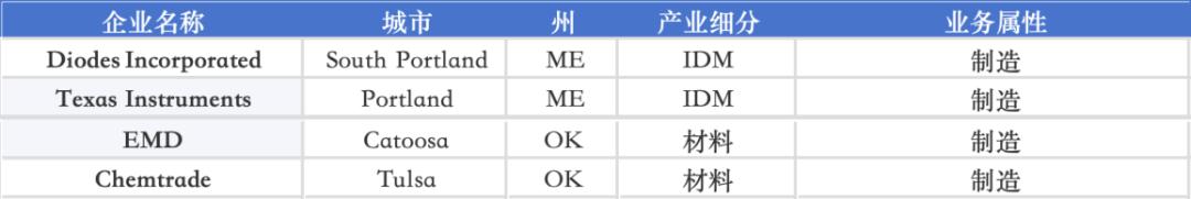 此外,缅因州(ME)由 Diodes Incorporated与 Texas Instruments承担模拟与特色制程供应链,俄克拉荷马州(OK)则由EMD与Chemtrade提供材料补链能力,进一步强化美国南部与内陆制造网络。