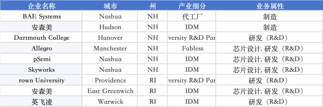这一科研带还涉及新罕布什尔(NH)与罗德岛(RI)等新英格兰地区州份:NH 内聚集 BAE Systems、安森美、Allegro、pSemi、Skyworks 等国防电子与射频 IDM 势力,而罗德岛(RI)则由 Brown University、安森美、英飞凌形成“材料 + 功率器件 + 大学科研”协同体系,更进一步强化东北区域在国防电子、功率电子与科研体系的深度链接。