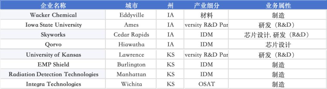 Iowa 与 Kansas 通过 Iowa State University、University of Kansas 等高校形成纳米器件与辐射检测等细分方向,EMP Shield、Integra Technologies 等公司则承担国防与特种电子制造;