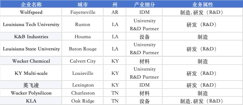 在美国南部内陆,Arkansas(阿肯色)、Louisiana(路易斯安那)、Kentucky(肯塔基)、Tennessee(田纳西)共同承担材料与设备补链:阿肯色由 Wolfspeed 承担化合物半导体 IDM,路易斯安那由 Louisiana Tech / LSU 和 K&B Industries构成科研与设备体系,肯塔基聚合 Wacker Chemical、KY Multi-scale 和 Infineon,田纳西则以 Wacker Polysilicon 与 KLA 完成材料与前道设备补位。