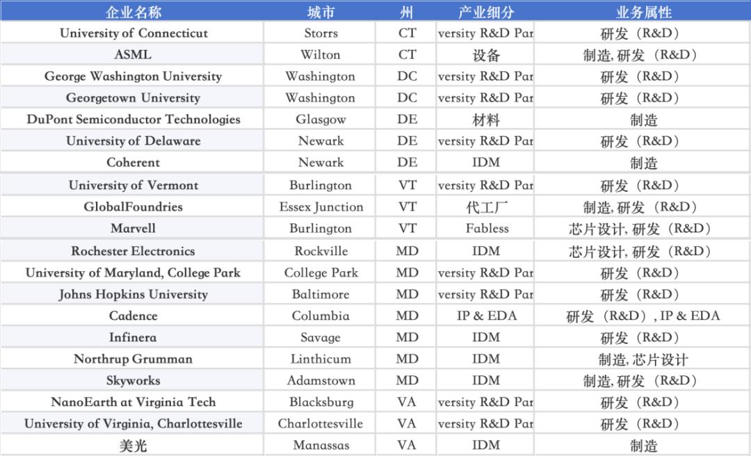康涅狄格州(CT)、佛蒙特州(VT)、特拉华州(DE)、华盛顿哥伦比亚特区(DC)、马里兰州(MD)和弗吉尼亚州(VA)半导体生态布局情况