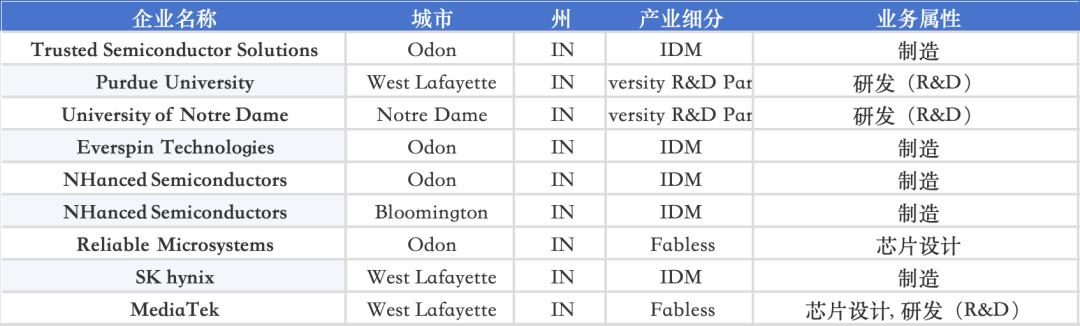 Indiana 拥有 Purdue University 与 Notre Dame 两大研究型大学,配合 onsemi、NHanced Semiconductors、SK hynix 等 IDM 企业,强化特色工艺与封装能力;