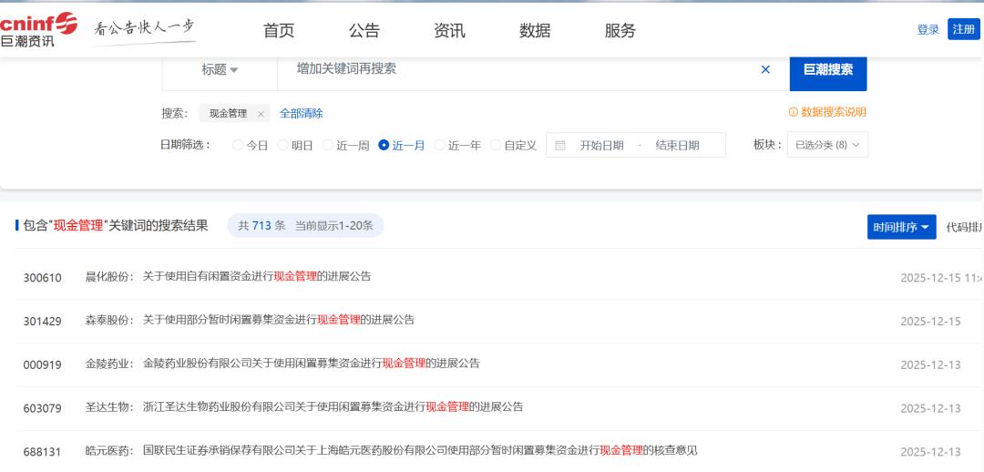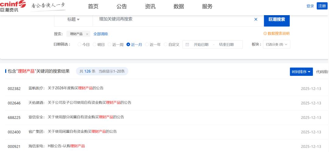 实际上,在巨潮资讯网( 证监会指定的上市公司信息披露平台 )用关键词 “ 现金管理 ” 和 “ 理财产品 ” 进行搜索,你能看到最近一个月分别有 713 和 126 条公司公告,所以你很容易就理解,这是上市公司的一个基础操作,具有普遍性。