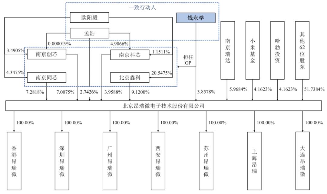 从最新的昂瑞微股权架构来看,该公司目前没有控股股东,董事长及总经理钱永学为实际控制人。钱永学合计控制62.43%的表决权,其直接持股3.86%,并通过特别表决权机制直接控制21.95%的表决权;通过北京鑫科间接控制9.12%股份,通过特别表决权机制间接控制28.54%的表决权;通过南京创芯、南京同芯、南京科芯间接控制10.38%的表决权;同时通过一致行动关系间接控制1.56%的表决权。