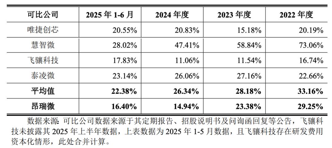 与同行业上市公司研发费用率对比,昂瑞微低于行业的平均水平,招股书显示,主要系营业收入规模不同所致。