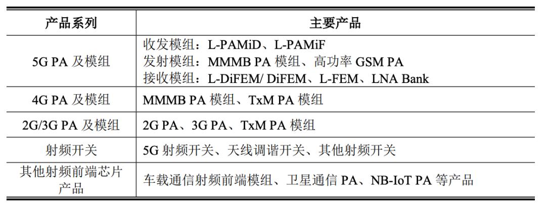 截至目前,其已量产出货L-PAMiD、L-PAMiF、DiFEM/L-DiFEM、 L-FEM、MMMB PA等模组,覆盖5G/4G/3G/2G、NB-IoT等通信标准下多种网络制式通信。