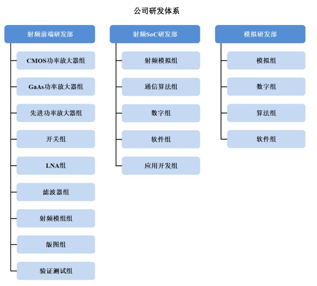 昂瑞微在北京、上海、深圳、广州、西安、大连和中国香港等地均设有研发机构,按照研发的产品类型及应用场景划分,分别设立了射频前端研发部、射频SoC研发部和模拟研发部,该公司研发部门的架构设置情况如下图所示: